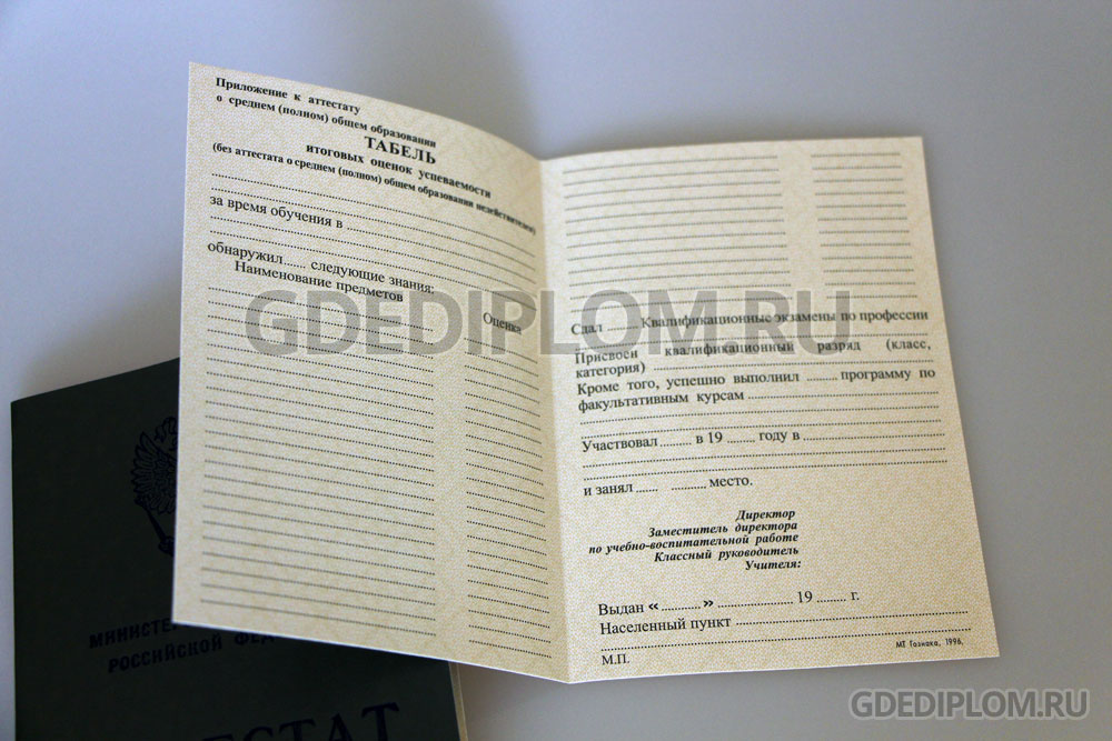 Gервого Российского образца, увидевший свет после распада советского союза, начиная в 1994, 1995, 1996, 1997, 1998, 1999, 2000, 2001, 2002, 2003, 2004. Бланк “Гознак”, заполнение по стандартам, ставится мокрая печать, подпись директора. Оценки по Вашему желанию или на наше усмотрение. Доставка бесплатно, оплата при получении.