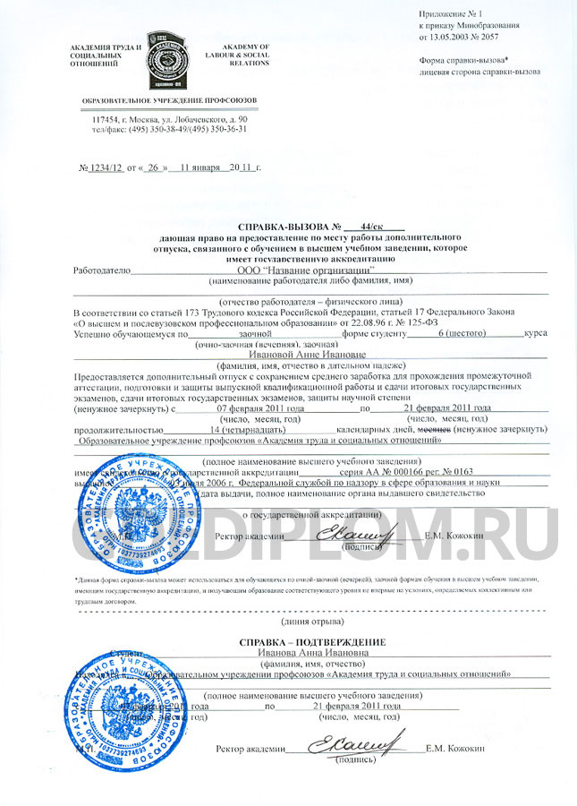 На нашем сайте Вы можете купить справку-вызов на сессию из любого ВУЗа страны. Справку используют для получения дополнительного отпуска в соответствии со 173 статьей Трудового кодекса. Справка вызова заверяется оригинальной синей гербовой печатью выбранного Вами учебного заведения и подписями ответственных лиц.